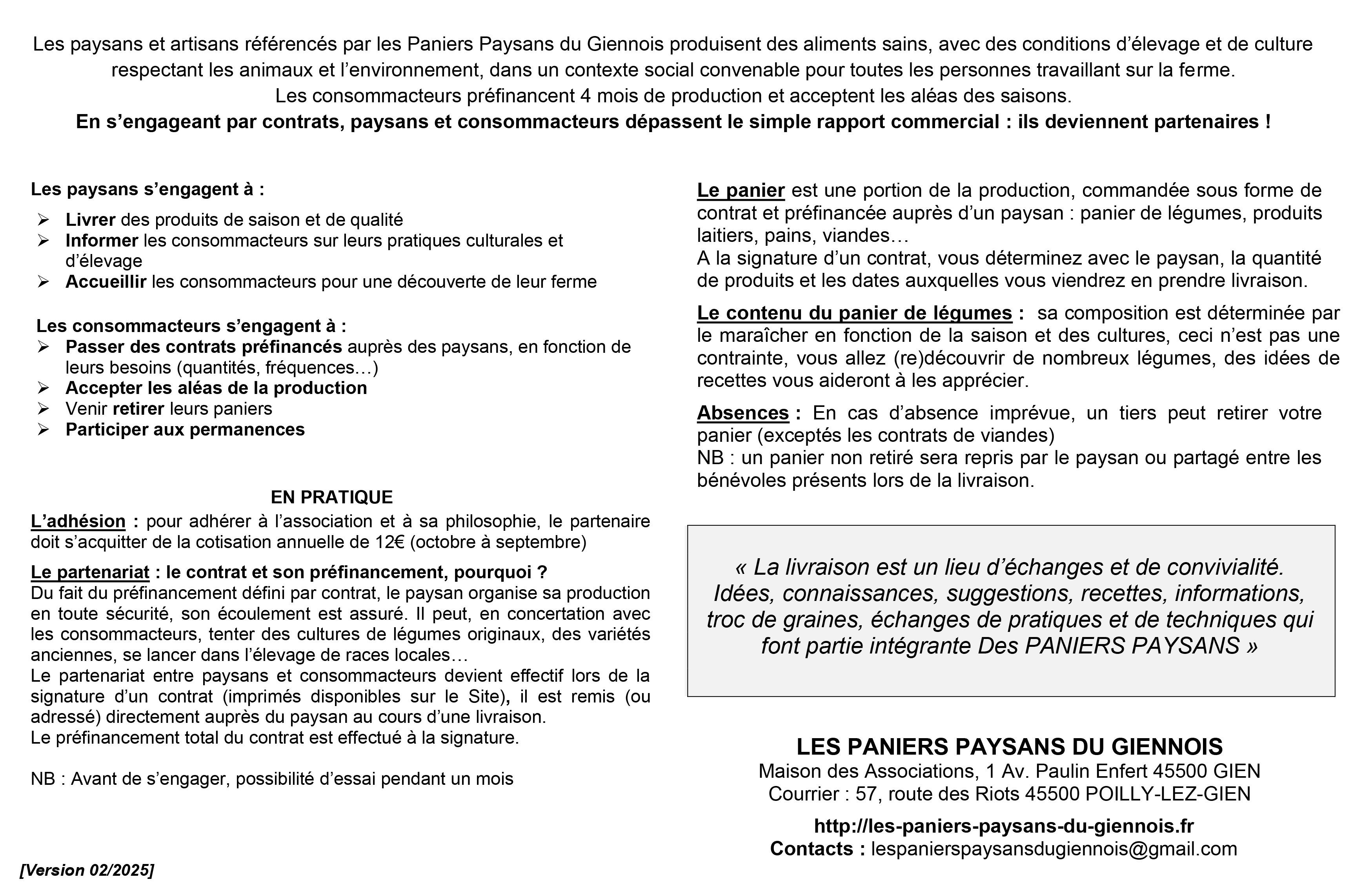 Les paysans et artisans référencés par les Paniers Paysans du Giennois produisent des aliments sains, avec des conditions d’élevage et de culture respectant les animaux et l’environnement, dans un contexte social convenable pour toutes les personnes travaillant sur la ferme. Les consommacteurs préfinancent 4 mois de production et acceptent les aléas des saisons.